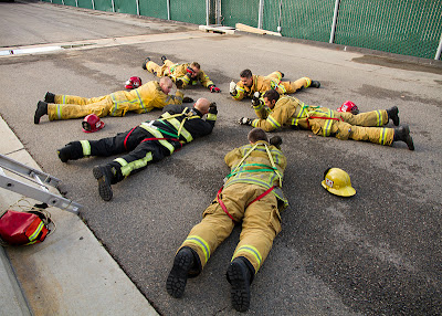 The images and captions below document a recent "train the trainer" session, covering the ladder bail procedure and the set-up for teaching the class. The "students" are peer instructors, who assist the training division in training crews on their shifts. As at least 12 multi-company drills covering this evolution will be performed, it is important that everyone is getting the same material. Hence this session.